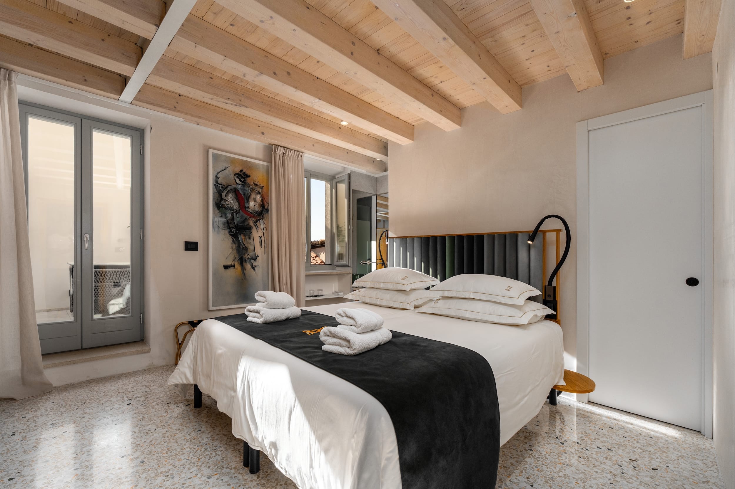 Luxury double room of 28m2 with double or twin beds located on the second floor of the hotel. The sunny, airy, high-ceilinged room features designer furniture and hand-made floors and walls, all of which together make the stay extremely comfortable. From the west window guests can enjoy a magnificent view of the sea, the old town center and the church of St. Euphemia, and from the east window a view of a typical Rovinj street. The room has a terrace with a beautiful view of the sea and the old town with the church of Saint Euphemia. The room has a private bathroom with a walk-in