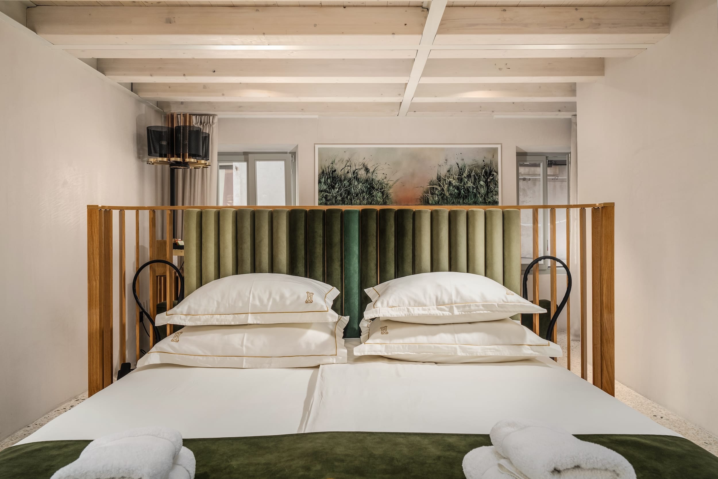 Double room with an average size of 18m2. Decently decorated with specially designed furniture, a large double bed and selected bedding. The floors in the rooms are an interesting combination of parquet and handmade Venetian terrazzo. The walls are decorated with a special marmorino technique. The room has a private bathroom with a walk-in shower. In the bathroom, guests can find all the necessary L’Occitane cosmetics and a hair dryer. Bathrobes, slippers, beach bag, coffee maker, mini bar, flat screen TV with cable channels, wi-fi, air conditioning and safe are available to guests.